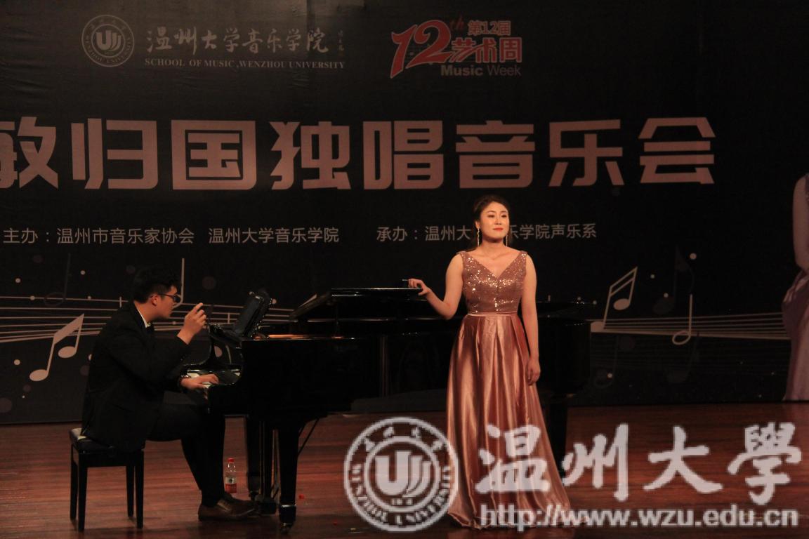 短暂的中场休息过后,张敏老师身着朝鲜族服饰重返舞台,为大家献上了朝鲜族作曲家崔三明先生的作品:《祖国怀抱多温暖》、《摘苹果梨的姑娘》,张敏老师采取了中韩文混合的形式来诠释两首作品,不仅让我们欣赏了朝鲜族民歌的独特曲风,还让我们感受到了祖国每一寸土地的热情与亲切,以及各个民族对祖国大地的赞扬之情,也让我们体会到了朝鲜民歌的强大魅力。随后,便是两首著名的韩国民谣《鸟打令》、《阿里阿里郎》,这两首经典之声让我们体会到了朝鲜族民族的别样风情和扣人心弦的音乐风格。张敏老师通过亲切甜美的歌声传递出了浓郁、独特的朝鲜民族特色。曲毕后特邀嘉宾于仁道老师为大家演奏了李斯特的经典曲目《Les jeux d'eau à la Villa d'Este》,一个个音符在于老师的手中跳跃,将在场每位观众都带入李斯特的音乐世界中。最后张敏老师带来了古诺的《Je vuex vivre》(From opera “Romeo et Juliette”)与威尔第的《Caro nome》 (From opera “Rigoletto”), 这两首歌也是本场的高潮,短促重复的高音、跨度极大的琶音、难度极高的弱音,每一个音都非常精准的控制。在最后一首歌,张敏老师非常调皮的踱着小步,坐到了台阶上和观众们亲切的互动。甚至在最后,张敏老师还躺了下来,即便如此,张敏老师的气息依旧非常稳定。