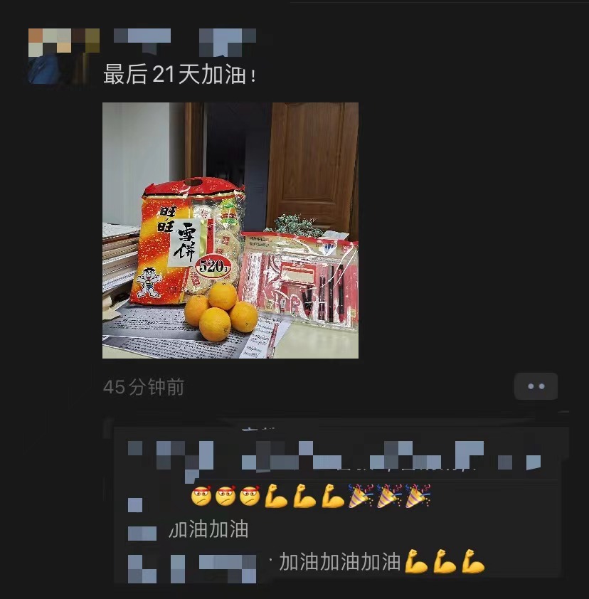 旺旺雪饼,寓意运气旺旺,希望同学们能够一“旺”直前、一“旺”到底;5个脐橙,寓意“我会成功”,希望同学们能够一鼓作气、马到成功、顺利上岸。