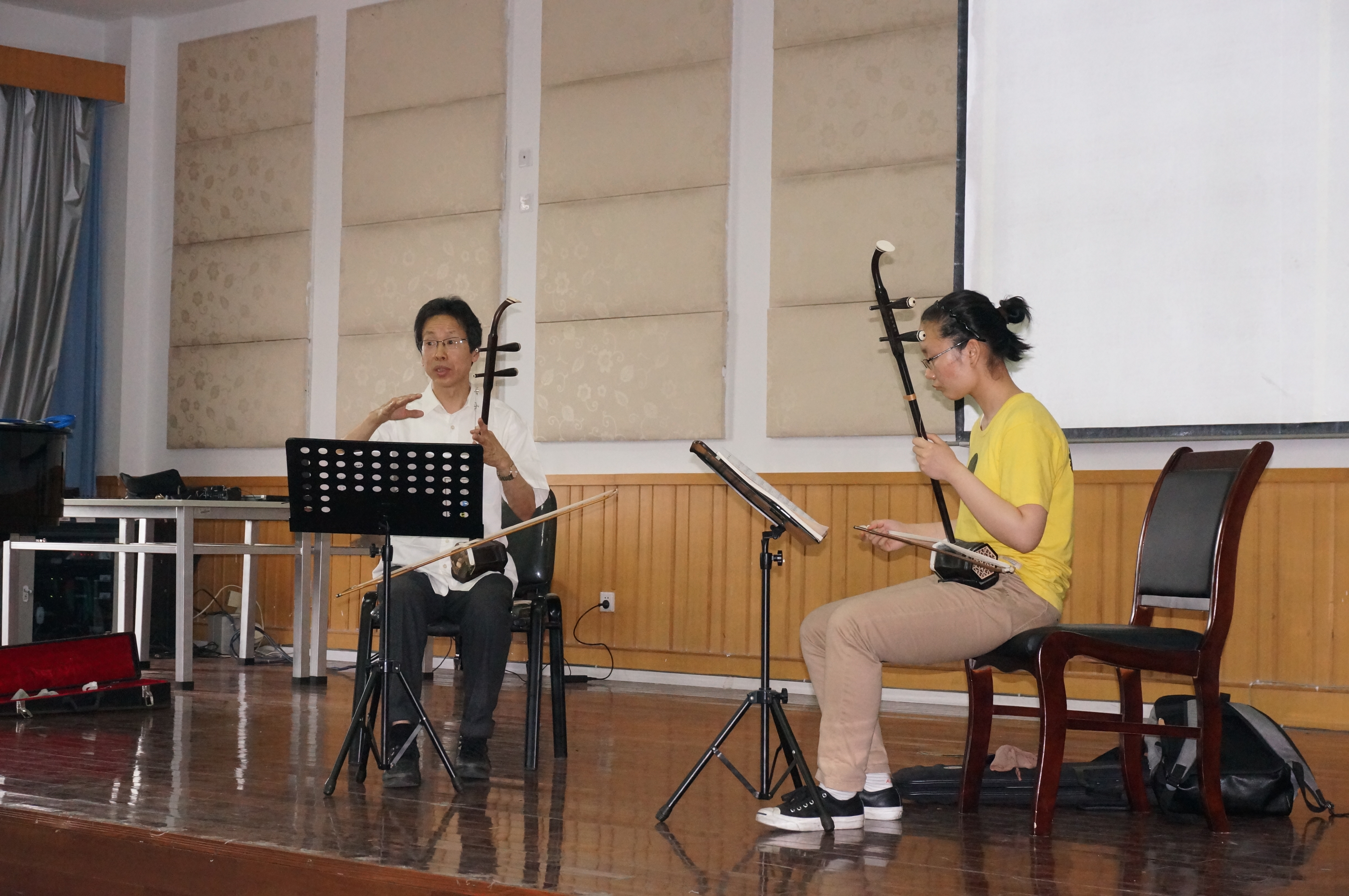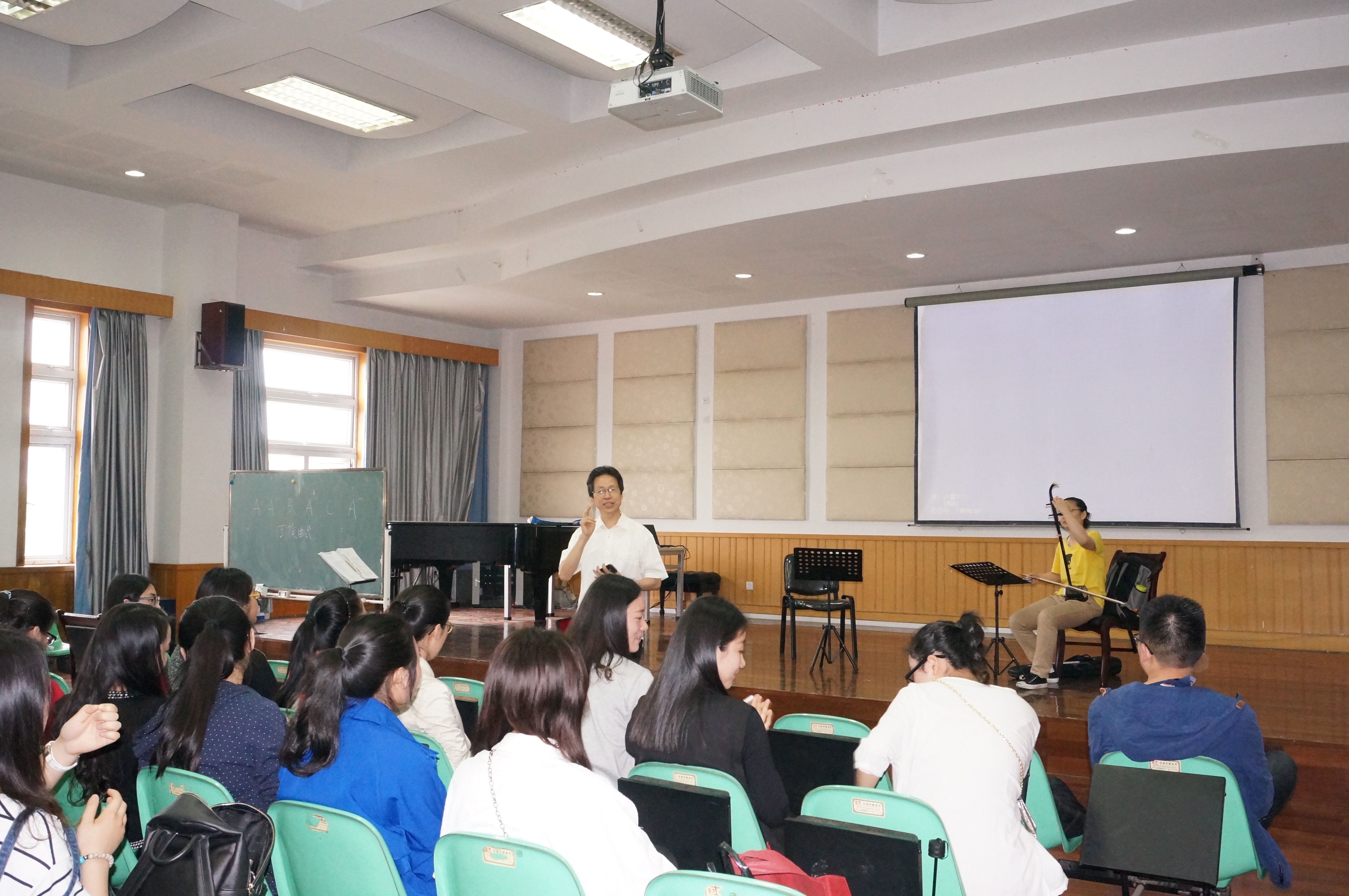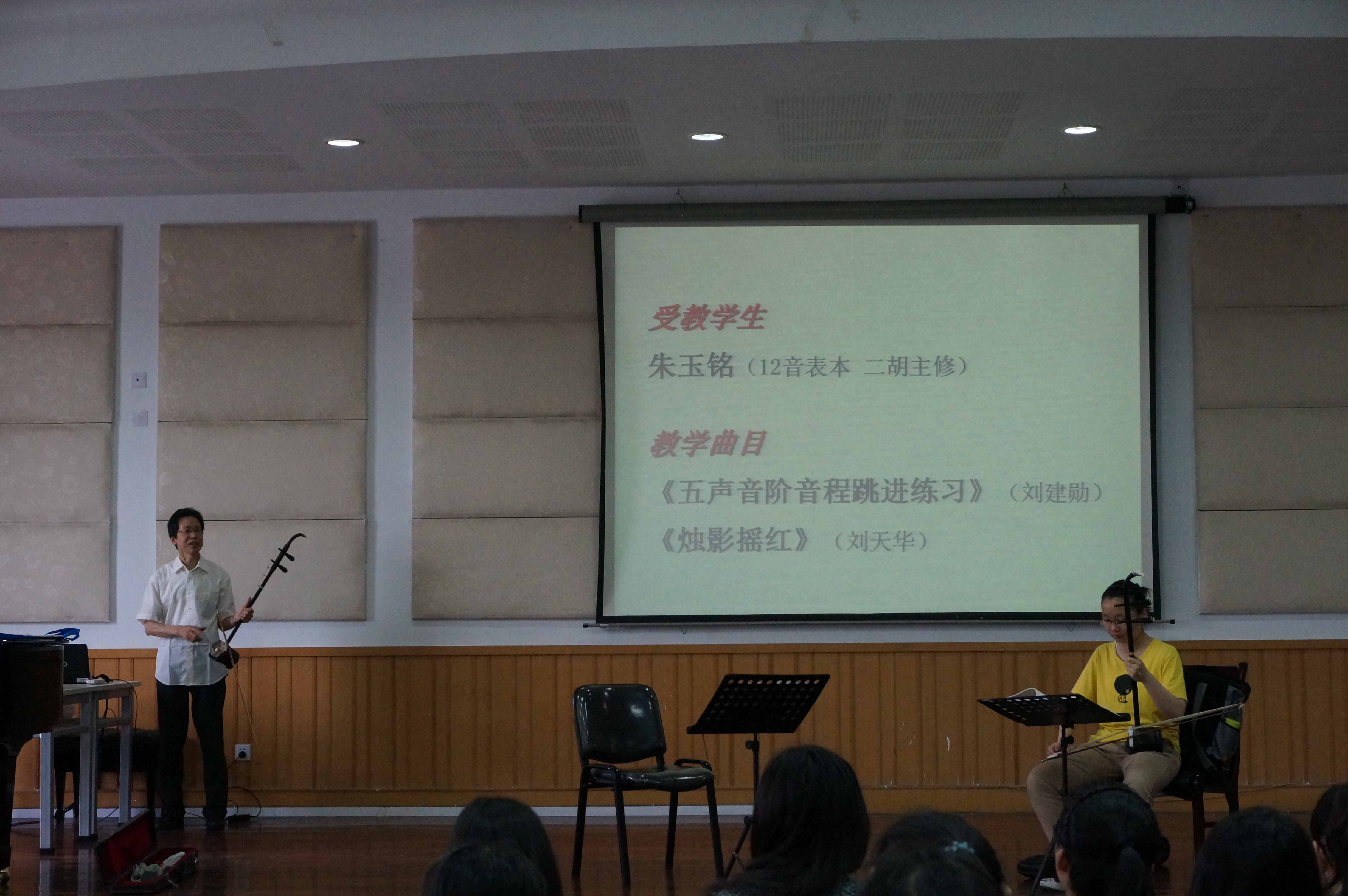 教学名师乔志亮教授,为大家展示了一堂精彩的《二胡》课。上午10点钟不到,音乐楼201学术报告厅已坐满了等待听课的师生。乔教授为12音表班的朱玉铭同学讲解示范了刘天华先生的二胡名曲《烛影摇红》。
