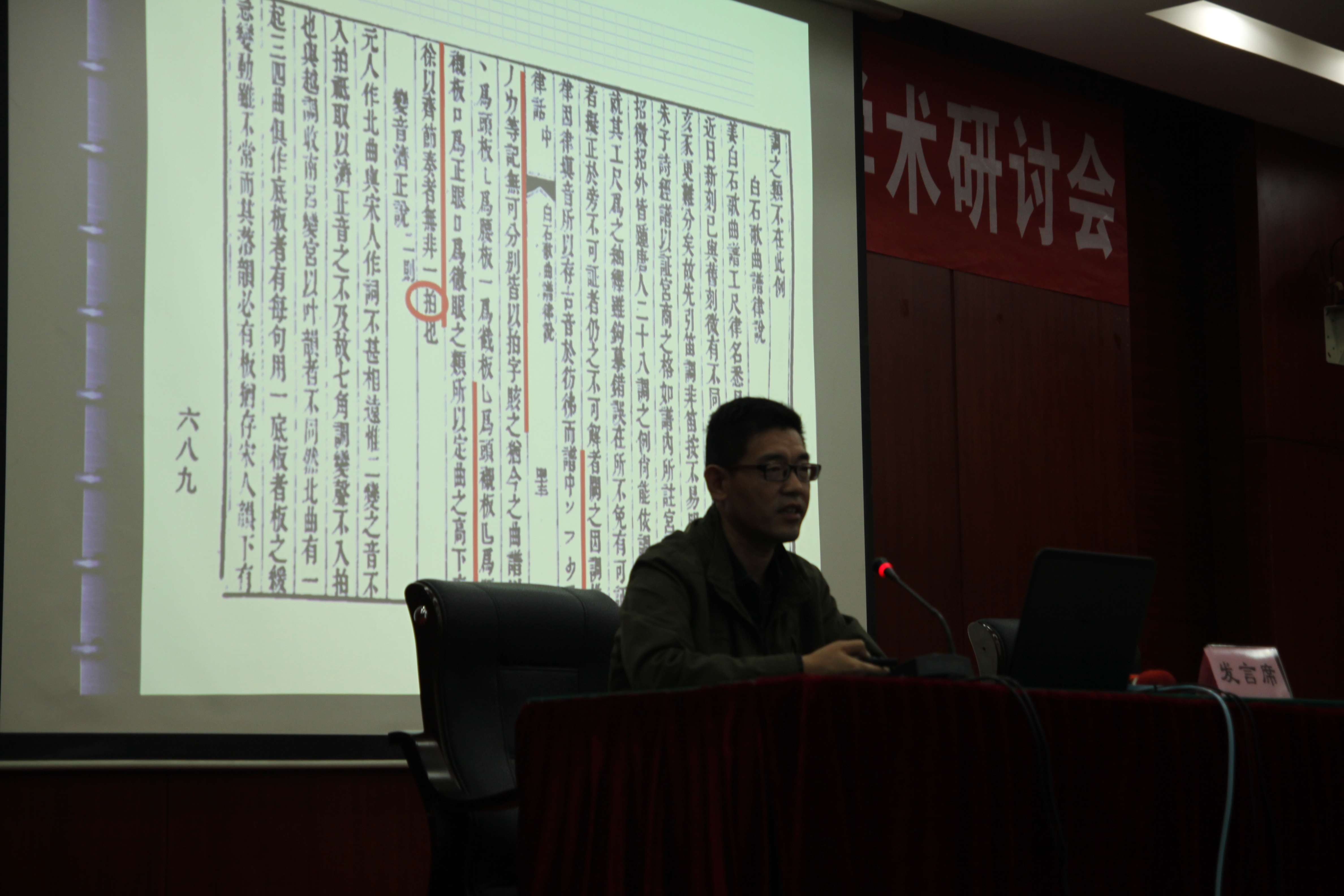 赵玉卿教授主持了16日上午的研讨会,并在大会上作了《姜白石俗字谱歌曲译谱之节奏研究》的学术报告。南宋姜夔《白石道人歌曲》对俗字谱的研究具有重要的史学价值,但在学术界中在译解姜白石俗字谱歌曲的节奏节拍方面仍存在着不少分歧。在学术报告中,赵玉卿教授梳理了姜白石俗字谱歌曲之节奏方面的研究观点,在此基础上提出了“一音一拍”“均拍”的新观点。赵玉卿教授认为对白石道人俗字谱歌曲研究之节奏的译解应以“一字一拍”为基础,采用“均拍”的观点划分小节,这样的译解方式更加接近白石道人俗字谱歌曲的原貌。在赵玉卿教授学术报告中提出的新观点引起了在座专家学者们的广泛关注,产生了较大的学术影响,得到了专家们的一致好评。
