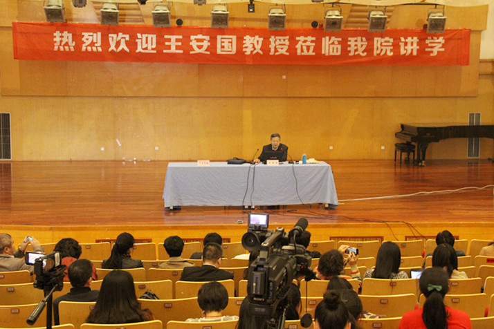 很是赞许,也很喜欢温州这个地方。王教授以PPT讲述中小学音乐教育的历史发展轨迹,并提出“涵养美感,陶冶情操”作为我国音乐教育的目标。同学们坐在位置上认真听着,王教授首先提到了当下影响或困扰我国中小学音乐教育进一步发发展和提高的因素,其中,主要问题是全国大面积学生接受不到充分的,均衡发展的优质音乐教育,简言之,不充分,不均衡是音乐教育现实存在的两大问题。 教授给同学们讲了音乐发展的历史, 介绍了中小学的教学内容,见证了中国音乐教育的发展, 中国在2001—2011这十年种,课改的成功实践及其间一度经历得曲折,从不同侧面给广大音乐教师以启迪,促进了我国中小学音乐教育教学水平整体提高。这一历史性进步在绝大多数大中城市学校体现得较为明显。接着又向同学们介绍“音乐本体”即音乐自身。在不同的语境下有不同推向——可以泛指音乐作品,音乐作品文本(乐谱)或音乐作品的音响,可以是指构成音乐作品的基本要素,也可以是指构成音乐作品,构成某种音乐风格或表现特点的内在规律。提到目前我国中小学音乐教育,在教育观念,内容方法,和课堂实践等方面,其总体态势正处于在平稳推进基础上寻求新的突破和提高的良好发展期。同学们看见了中国音乐教育前进的步伐。