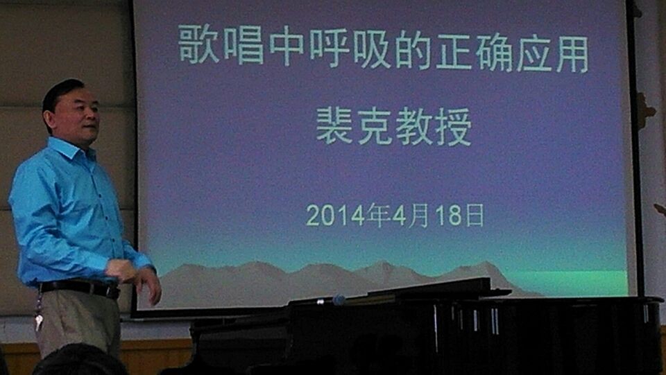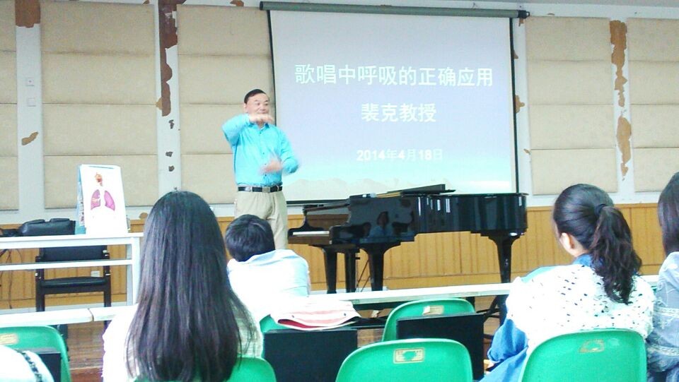 首先,裴克教授向大家展示了一张有关人体肺部的图片,解释了人体肺部的相关组成部分,以及气息从何而入从何而出。气运丹田就是把气尽量往下沉,丹田就是肚脐下方的气海穴,吸气的时候用腹式呼吸法,在腰部形成一个气环,唱歌的时候有气息的支撑,声音才更圆润好听,就像放风筝一样,有长长的线才能飞得更高。一位声乐专家说过:由呼吸控制的歌声才是声乐,呼吸是歌唱的原动力。因此声乐界有“谁懂得呼吸,谁就会唱歌”之说。