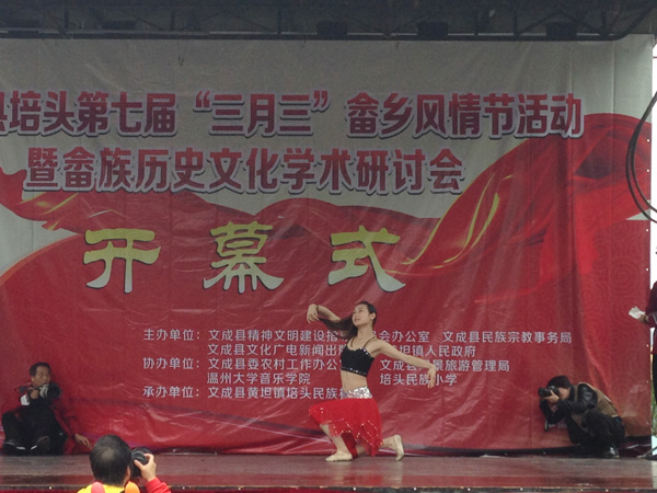 3月28日、29日,网络赌博网站 教师王志毅、蔡根畅、李恒子、张中灿以及在校研究生、本科生一行十多人赴文成畲族教学实践基地展演采风。并在第七届“三月三”畲乡风情节上表演了独唱、二胡独奏、舞蹈等节目,充分展示了学院风采。 “温州文成黄坦镇培头畲族村,作为网络赌博网站 的主要实践教学基地于2010年建立,四年来,一直与网络赌博网站 保持密切联系,并以实践教学为契机,在学生暑期社会实践、畲族音乐传统文化的采集与整理、学生与社会的交流等方面发挥了重要作用。并于2013年12月获得“温州市级社会实践基地的称号”。本次活动,除了为群众表演外,实践队伍还通过座谈、音乐舞蹈文化采样等方式采集了与畲族相关的历史与人文资料,拓宽了学生对于音乐文化多样性的视野,也为今后学院在畲族文化的创作上积累了宝贵的素材。
