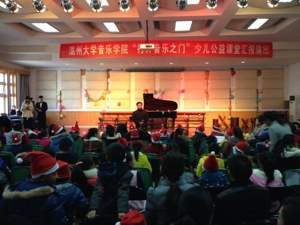 举办“打开音乐之门”公益讲堂活动的意义,以及对此次活动学生讲师和小朋友们表现的肯定,对各位教职工家长的支持表达了感谢。随后,汇报演出正式开始:两位身穿燕尾服的小朋友一起坐在钢琴前四手联弹一曲《小奏鸣曲》开场了整个演出,他们熟练的技艺征服了整个会场。合唱2班的小朋友们一起合唱了《虫儿飞》、《小雪橇》两首歌曲,带动了全场的气氛。乐理1,2班的全体小朋友也和他们的老师一起合唱了《哆来咪》、《小星星》,他们围着一起摇动他们的身体,带领大家一起走进那个美丽的世界。而合唱1班的《春晓》、《小乌鸦爱妈妈》更是令大家印象深刻,他们努力做齐动作,带着开心的笑脸,让现场的家长们都开心的鼓起掌来。最后的压轴演出是合唱2班的非洲鼓表演,节奏感十足的表演令大家都跟着一起摇摆起来,大家欢乐的笑着,唱着,仿佛置身于一个充满乐趣的音乐殿堂。
