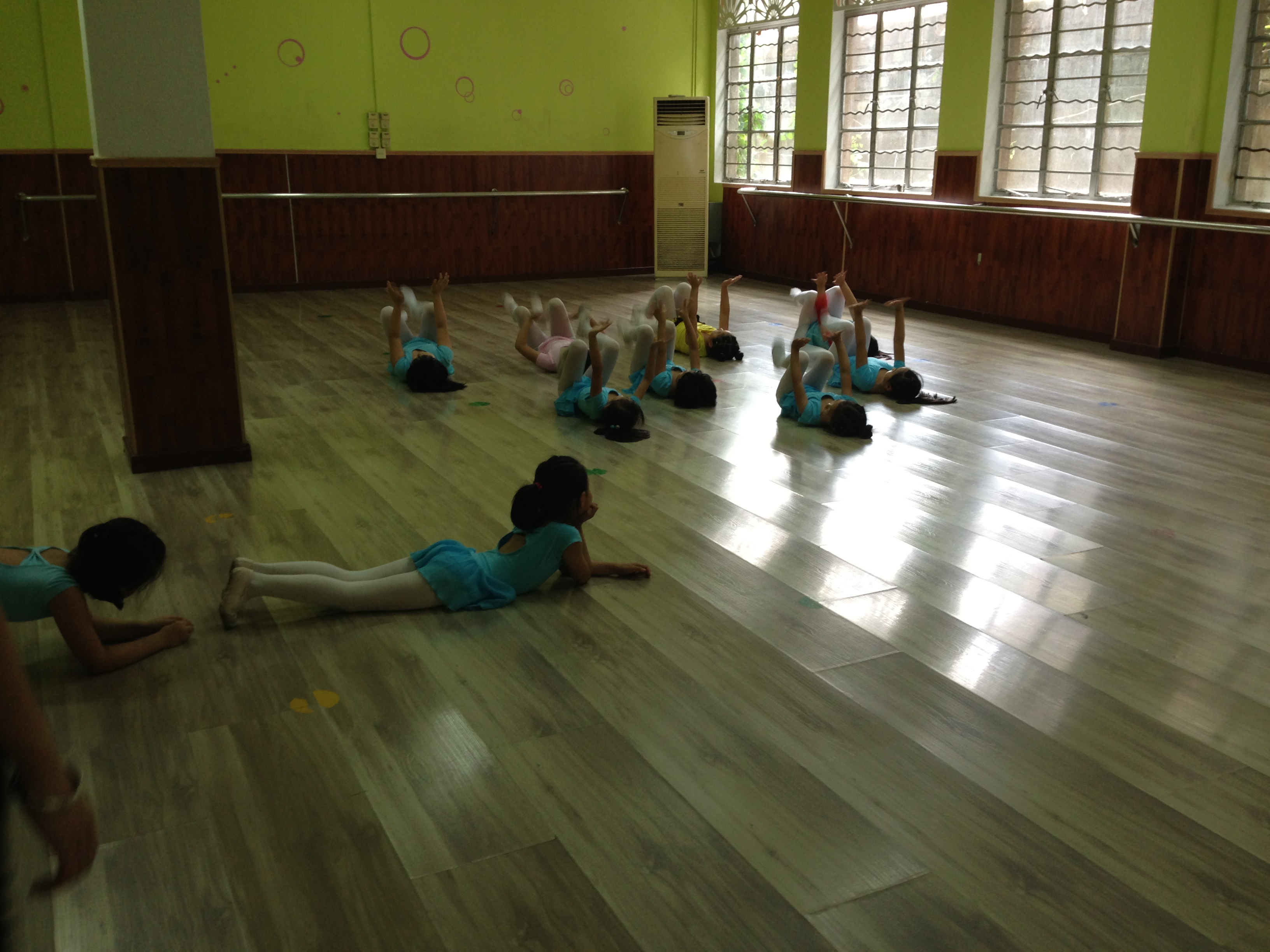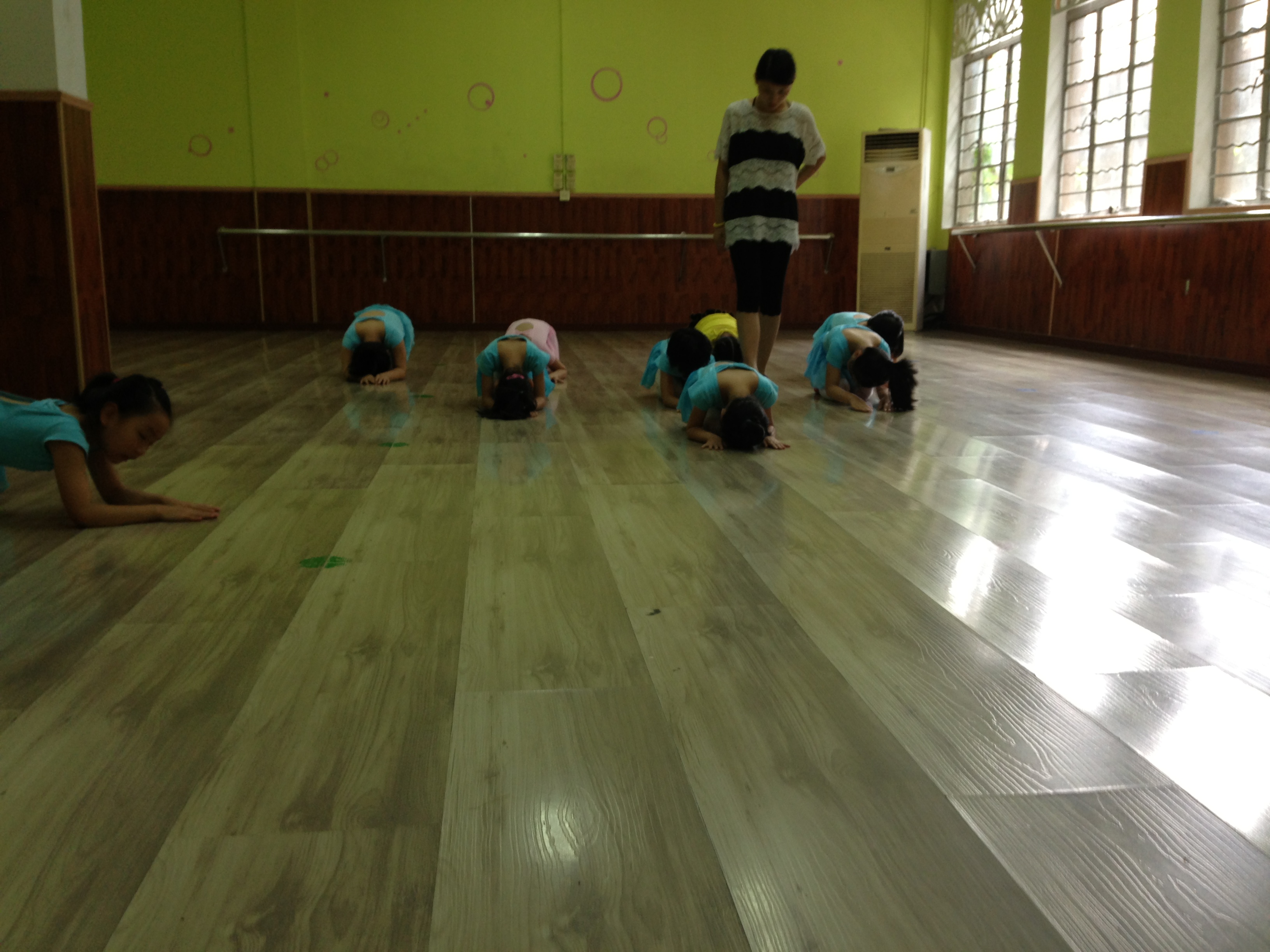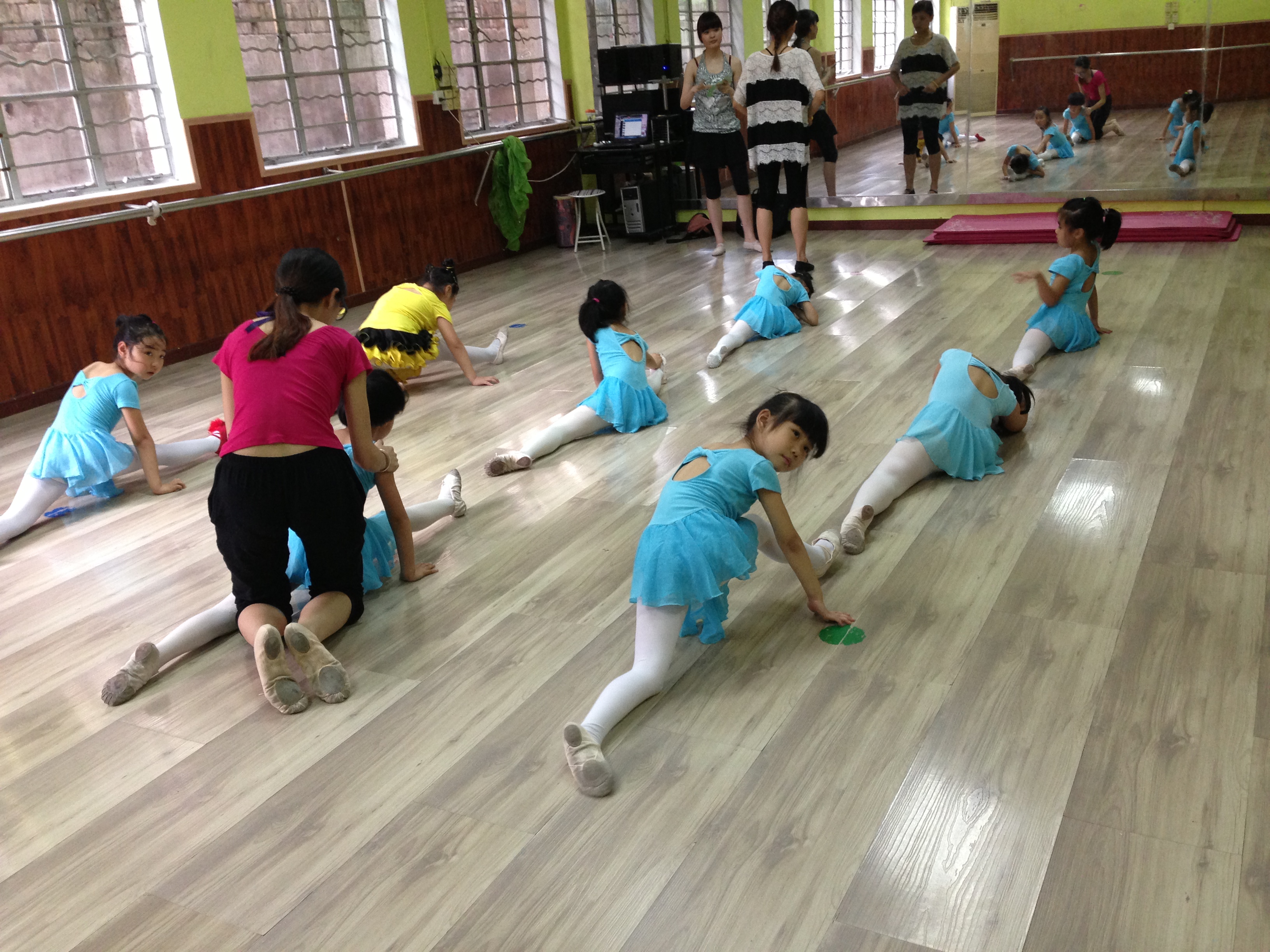开始上课。第一项,基本功训练。把杆压腿是一项重要的基本功训练过程。放一首欢快的音乐,小朋友们跟着音乐的鼓点一二三,二二三的压腿,压完腿抱腿,抱完腿耗叉。接着是踢腿,踢前腿,踢旁腿,踢后腿。踢完腿,踢抱前旁后腿,下大腰十个基本功训练就算结束了。第二项,成品舞排练。给小朋友排队型,教动作,到处充满欢声笑语,教学过程大家都很开心。碰到学的慢的小朋友我也会耐心的为他讲解,教会他们一个动作就会有很大的成就感。