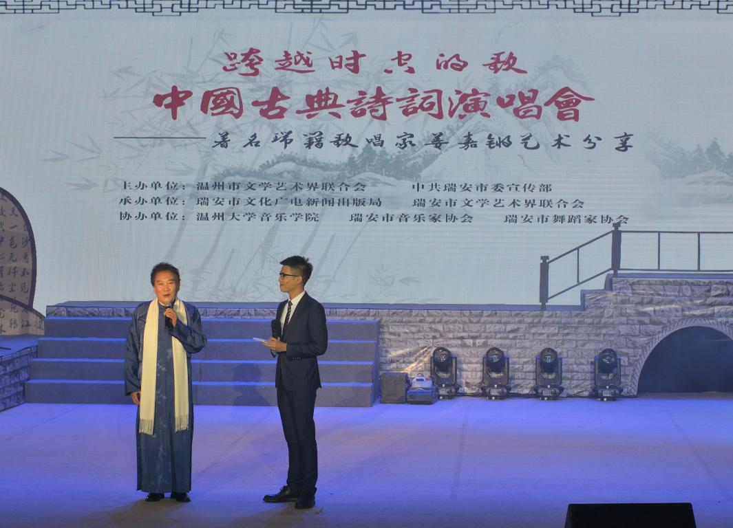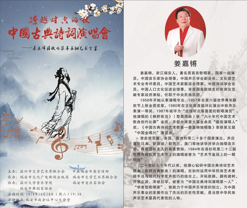 王文韬、胡敏、胡锦超、何晨燕、龚本丽、郑文杰、介百林一行参加了在瑞安市政会议中心大会堂举办的姜嘉锵艺术分享《跨越时空的歌——中国古典诗词演唱会》,此次演唱会由温州市文学艺术界联合会与中共瑞安市委宣传部主办,瑞安市文化广电新闻出版局与瑞安市文学艺术界联合会承办,网络赌博网站
