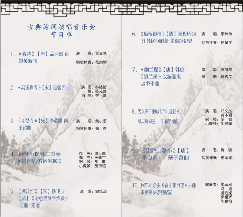 的曲目《这相思仿佛寒暖》与《月儿轻轻》都是由缪天瑞先生作词作曲的。钢琴的柔情,小提琴的缠绵,歌声的优雅,三者巧妙的组合在了一起,清晰的诠释了此次演唱会的主题,交织出了一幅优美的古典诗词图,博得了阵阵掌声。