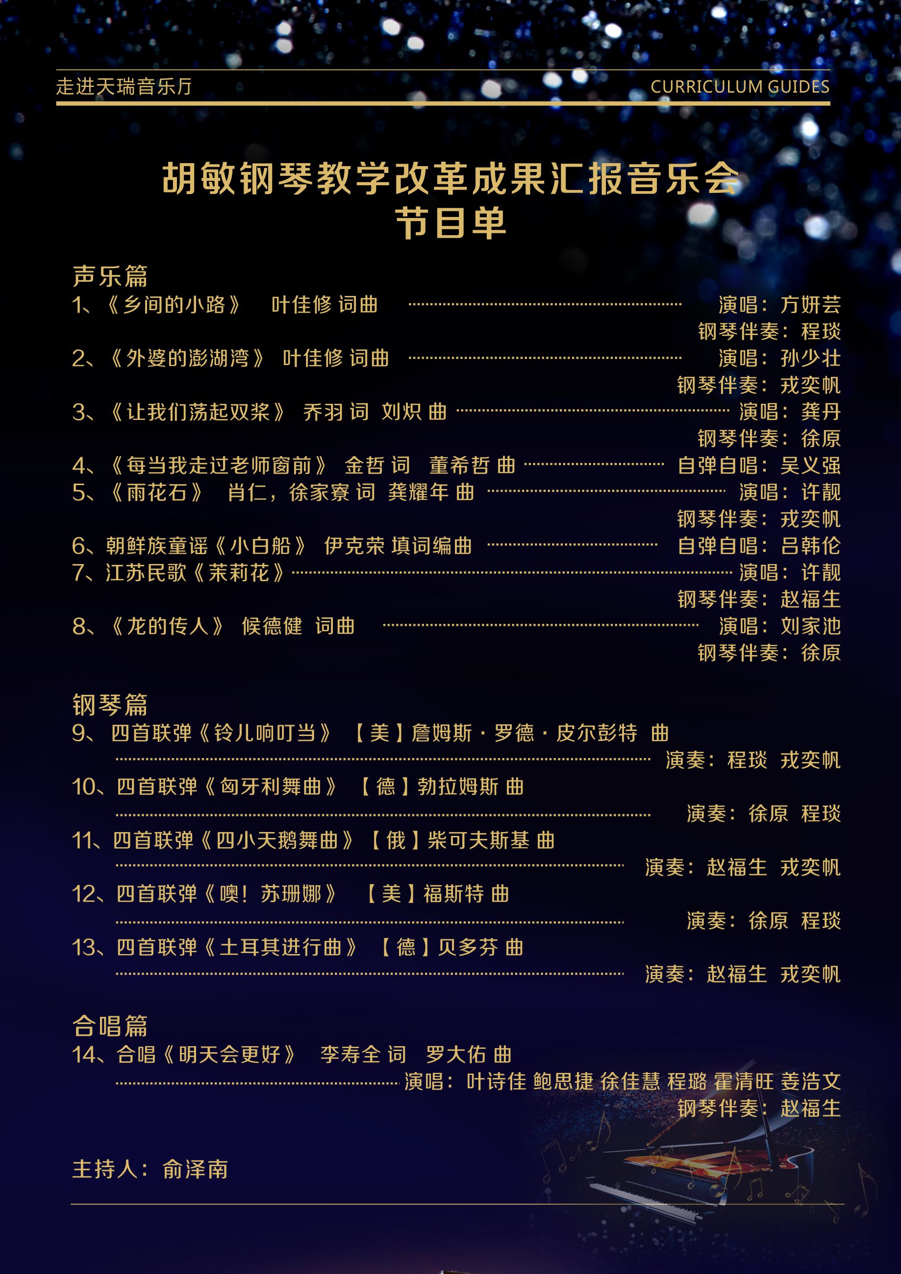 的教学改革成果在这个展演平台上展示,尚属首次。胡老师根据不同的展演组合形式,将精心准备了的14个节目,分为声乐篇、钢琴篇和合唱篇,一一呈现。分散在不同年级且有着不同专长的20多位同学,共聚在同一个舞台,拿出了最好的自己,接受了观众席上广大师生及市民观众的检验。