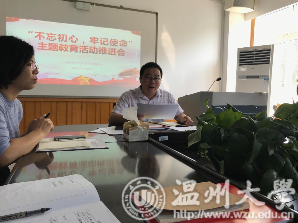 党委在音乐楼203会议室召开“不忘初心、牢记使命”主题教育工作推进会。全体教工党员、学生党员出席会议。会议由学院党委书记朱启鑫主持。
