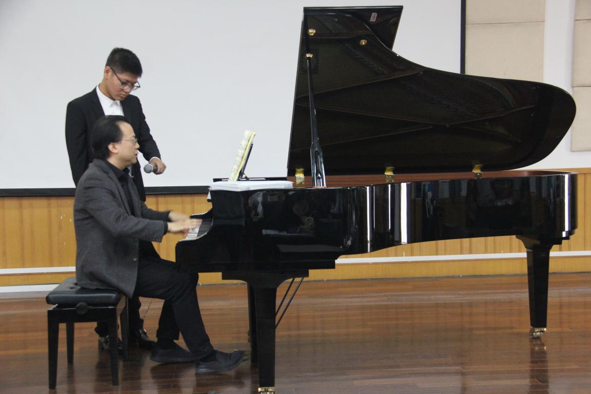 学生徐梦婷弹奏的张帅《三首前奏曲》和袁新凯弹奏的《革命练习曲》。在学生弹奏出现问题时,唐教授会悉心指导,方式生动有趣,也会身体力行亲自示范。不由让我们在尊敬唐教授的同时又觉得亲切。