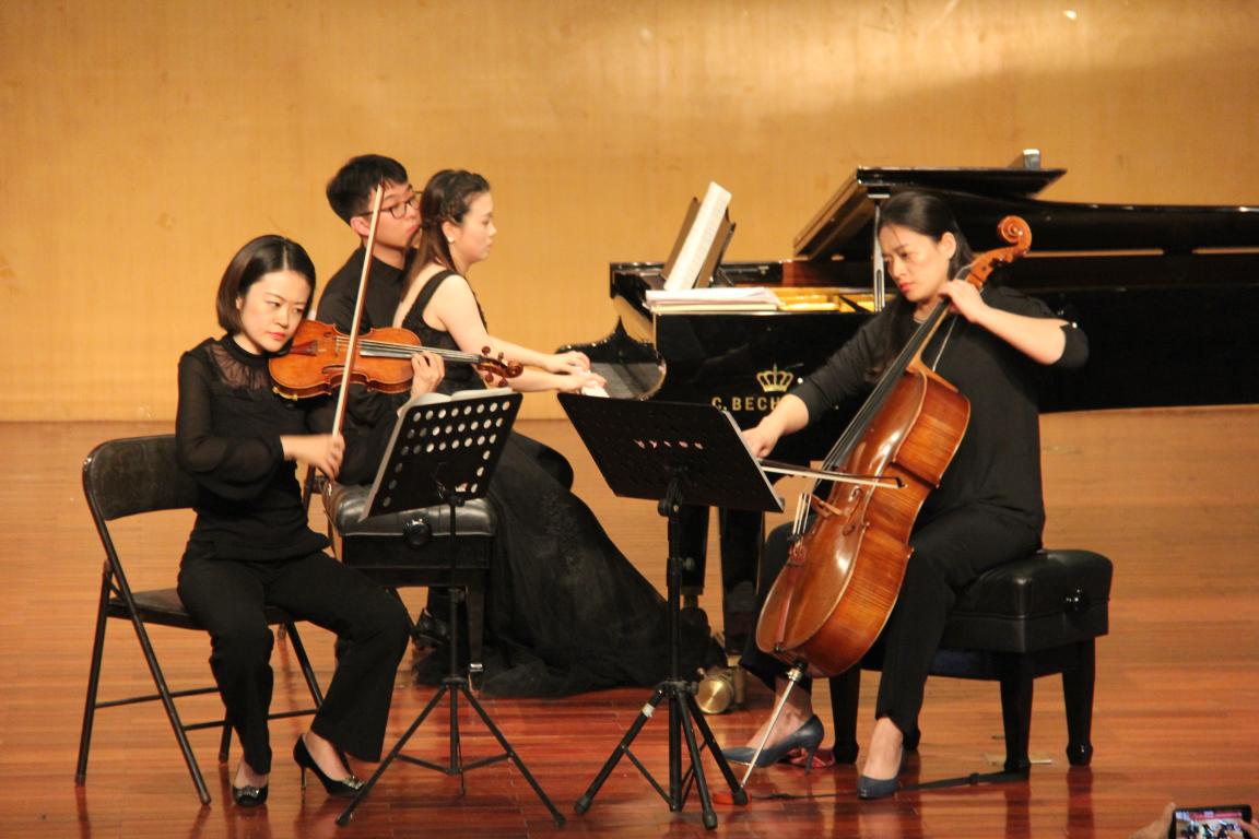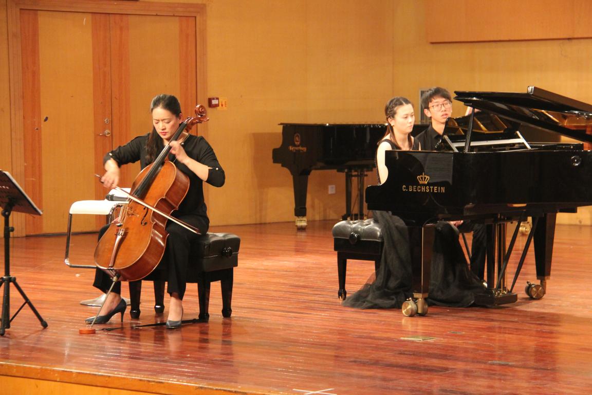 首先是陈露雯博士的“Coffee&Tea”室内乐讲演音乐会,陈博士先是为同学们解释了何为“Coffee&Tea”,让同学们了解了这一概念,然后陈博士与受邀而来的蒋乐乐博士共同演奏贝多芬小提琴奏鸣曲No.5 Op.24 “春天”,给同学们带来了美妙的听觉享受。接着陈博士又与赵光雯博士一起演奏卡萨多 “情话”,演奏前陈博士提到,与大提琴这类低音乐器合作时,钢琴要尤为注意琴声的大小,因为琴声太大容易盖过大提琴的声音。之后两位博士开始尽情的演奏,两位演奏者都完全沉浸在音乐里,同学们也都被这氛围感染。演奏结束后,现场响声犹如雷鸣般响亮。然后是钢琴与琵琶合作,演奏“云想花想”,给同学们带来了极强的感官享受。在然后是钢琴与二胡协奏“楚颂”,由陈博士与大四的学长共同演奏,温柔的琴声与呜呜然而又婉转的二胡声相结合,碰撞出了强烈的火花。最后由陈博士、蒋博士与赵博士合奏 皮亚佐拉“春”,使得这场音乐会达到最高潮,第一场音乐会圆满结束。