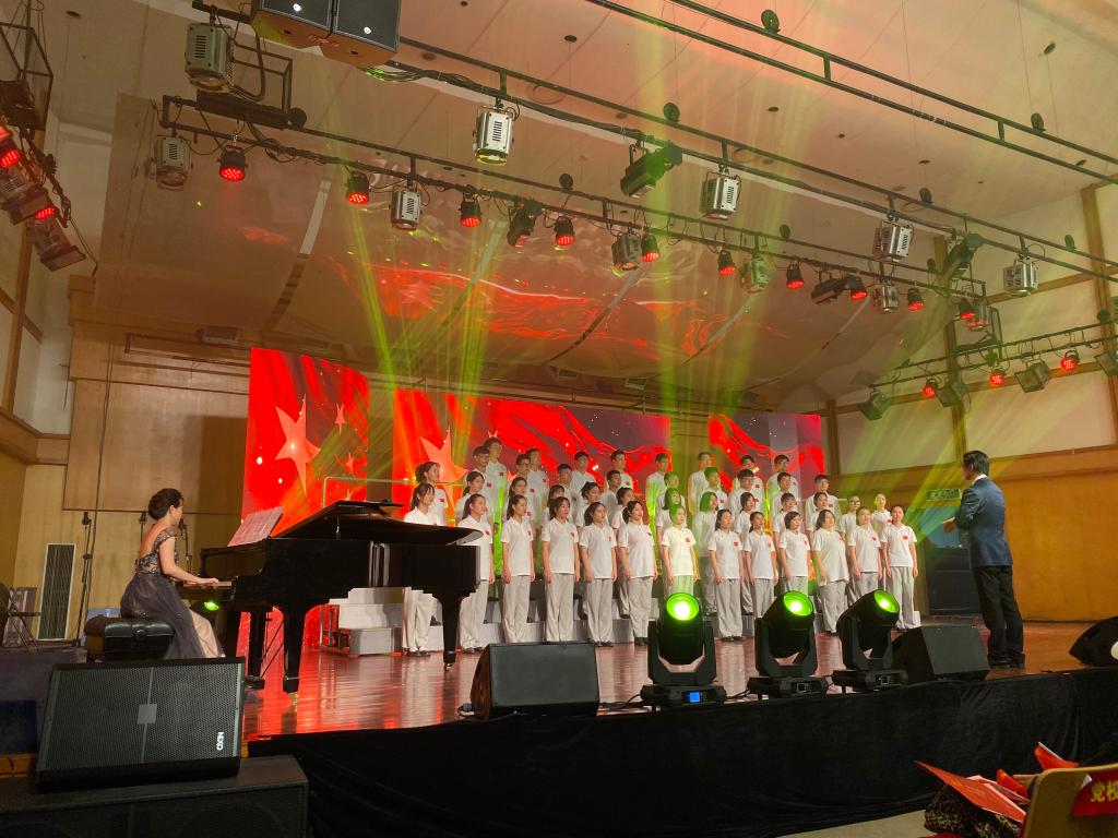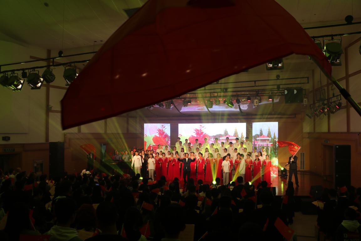 师生观看了整场晚会。音乐厅400多个位置,座无虚席。许多外国留学生也来观看演出,和中国同学一起挥舞着鲜艳的五星红旗。当演出结束时,全场观众与舞台上“鸿音传承”党员先锋服务团团员一起唱起了《我和我的祖国》。此时,台上是一杆鲜艳的五星红旗,台下是无数挥舞的五星红旗,整个音乐厅成了一片沸腾的海洋。爱国、爱党在这场晚会里,成为直抵人心的力量,激励鼓舞着每一位演员、每一位观众不忘初心、牢记使命、砥砺前行!