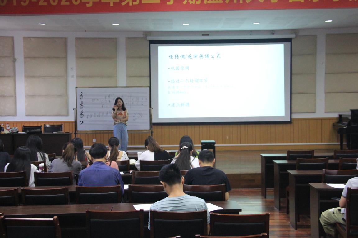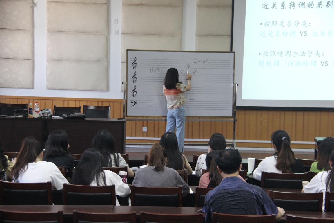 首先,郑老师为我们讲述了近关系转调的类别,按照关系分类是近关系转调与远关系转调;按照转调手法分类则是慢转调、逐渐转调和快转调加速转调。为了方便我们理解,郑老师还为我们举例了慢关系转调和加速转调的实例。