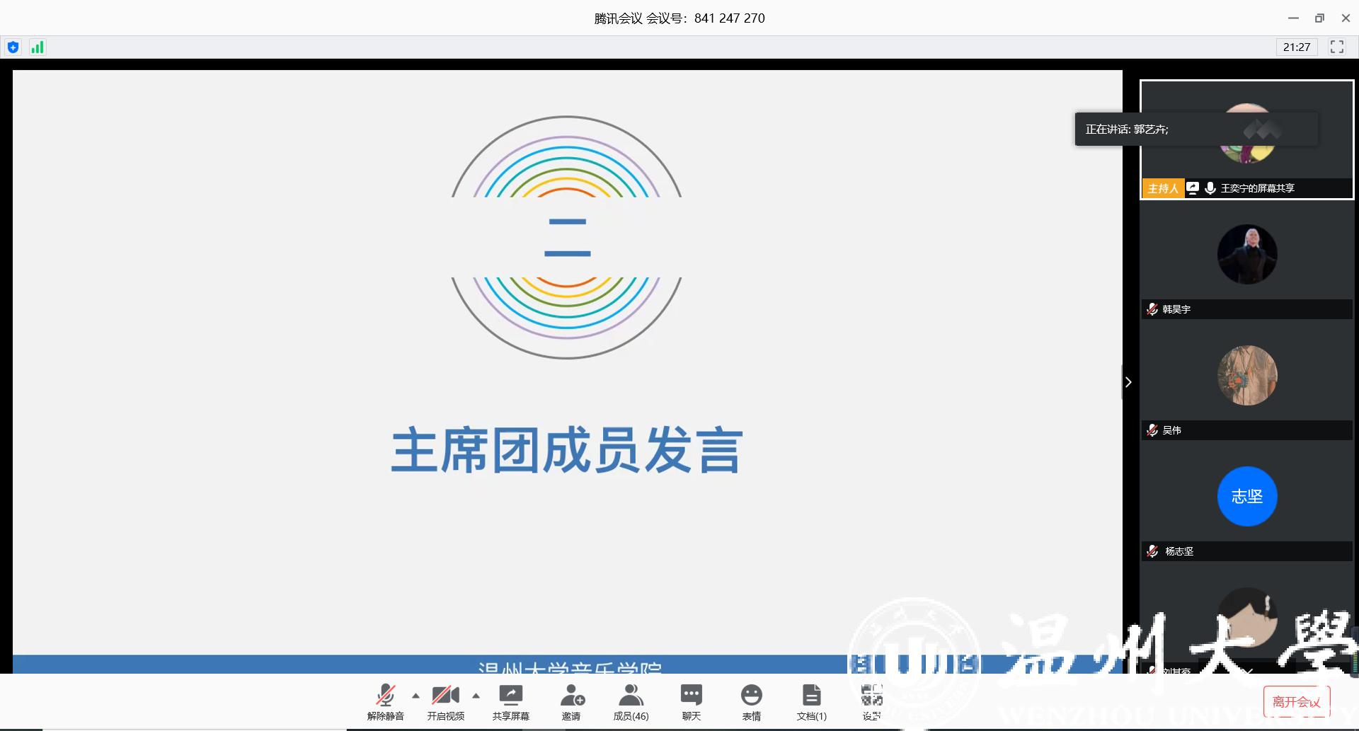 会议由团歌合唱开始后进入主席团发言部分,由钱佳文,王奕宁,郭艺卉,夏大强四位主席团成员发言,他们表达了对于学院团委会三年以来的情感,以及对于以后学院团委会的发展给予展望,怀念在团委会不断成长的过程,鼓励现在的成员们努力学习,不断进取。
