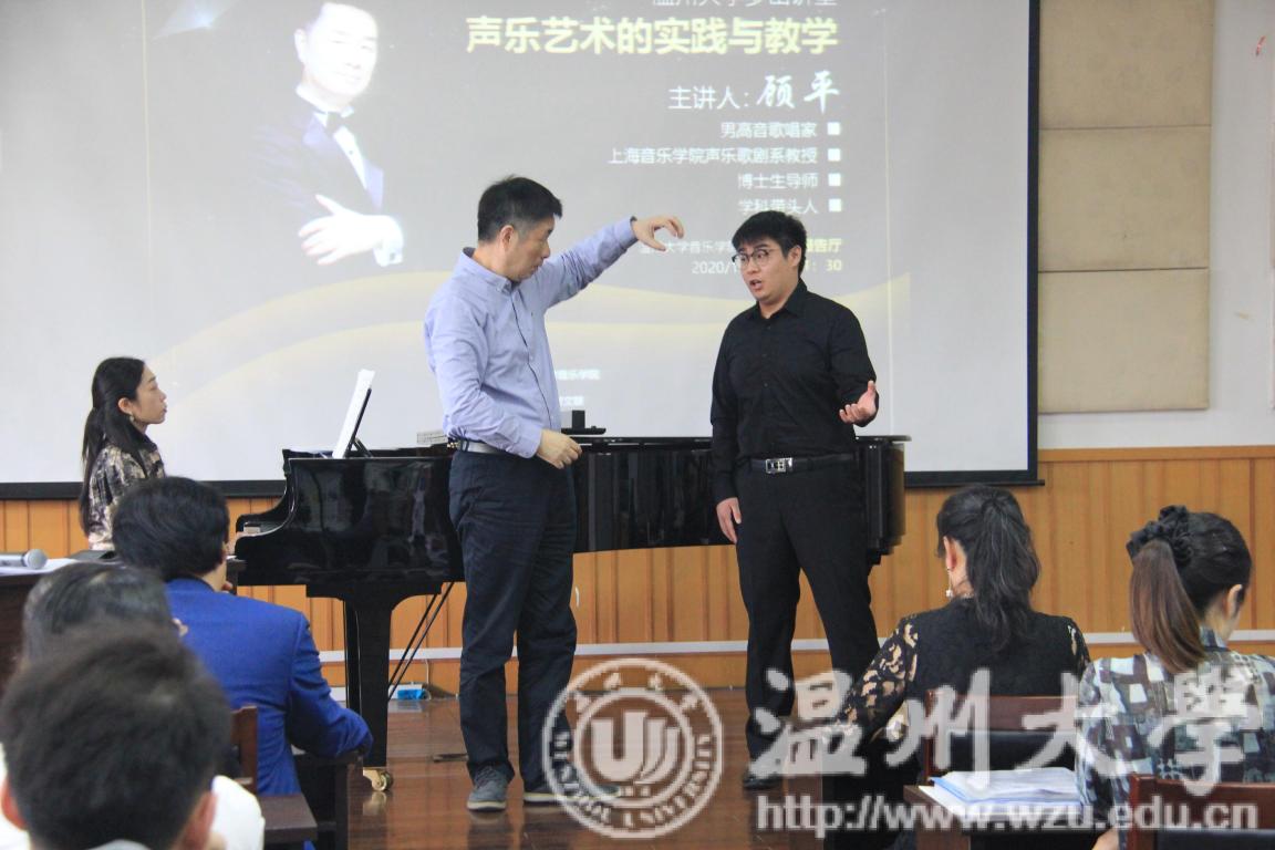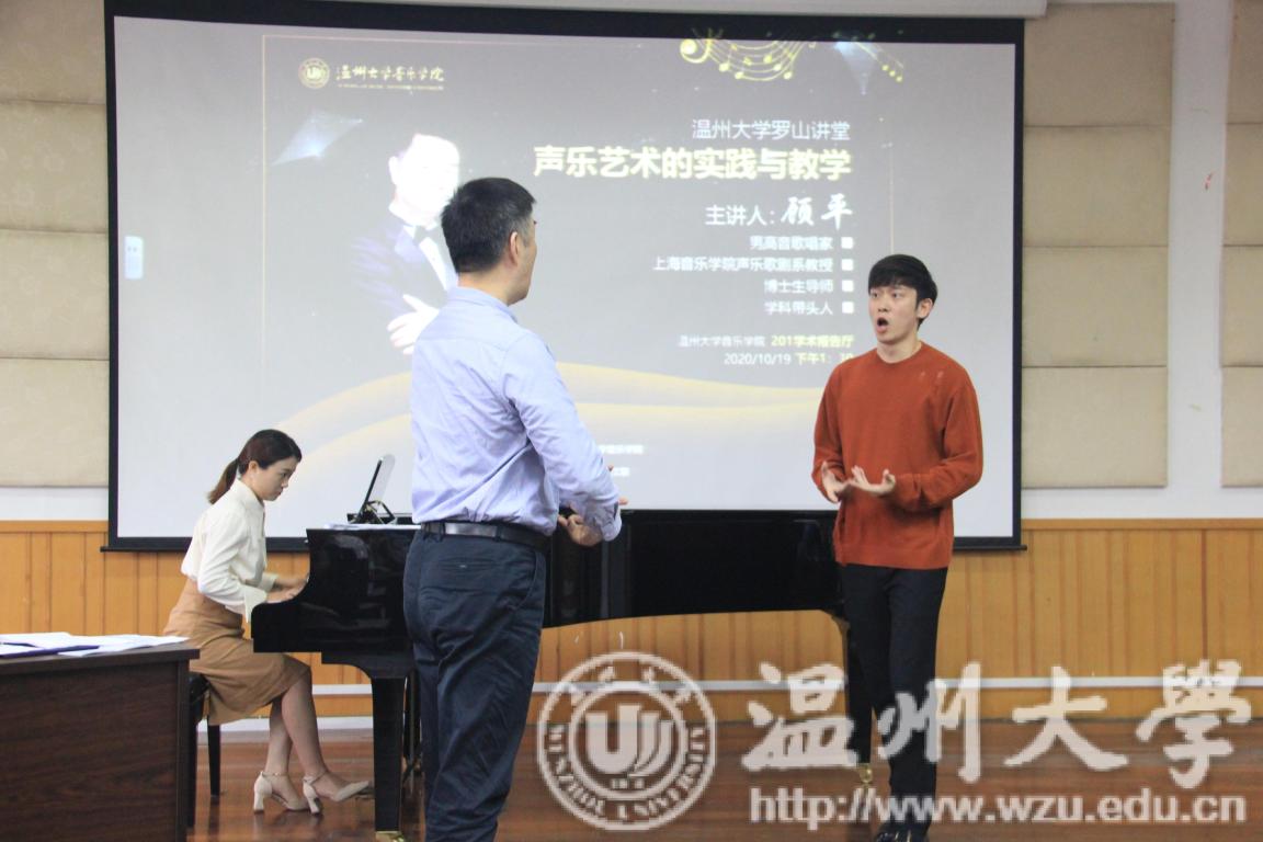 教师发展中心的青年教师以及温州市区音乐爱好者纷纷前来学习,全场座无虚席。讲座采取一对一教学指导的方式,更直观地展现声乐的魅力,方便大家的理解。顾教授分别在声音、语言、情感、舞台表演等方面对学生进行了专业地指导教学。