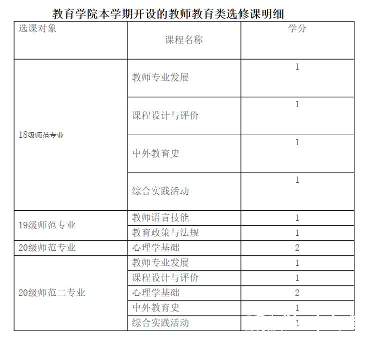 师范类专业本科人才培养方案要求,师范生需修读教师教育类选修课,其中18级需修满6学分,19级、20级学生对需修满3学分(具体以各自专业的培养方案为准)。该类课程设置分为教育学院面向全校师范专业统一选课开设及学生所在学院专业内独立选课开设两类。现开展教育学院面向师范专业开设教师教育类选修课选课工作,具体如下: