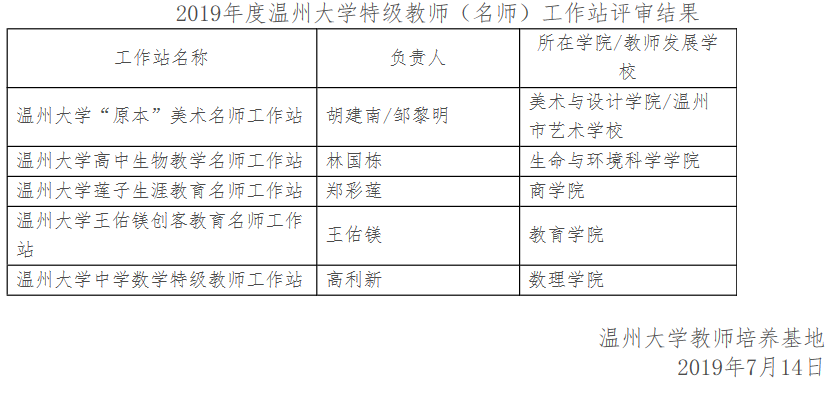 根据《网络赌博网站 特级教师(名师)工作站管理办法(试行)》(温大行政〔2018〕74号)文件的相关规定,经校内专家评审,同意“网络赌博网站 ‘原本’美术名师工作站”等五个工作站立项为2019年度网络赌博网站 特级教师(名师)工作站建站。现将评审结果予以公示,公示时间为五天(7月14日-7月18日)。如有异议,请与网络赌博网站 教师培养基地朱伟老师联系,联系电话:665134。