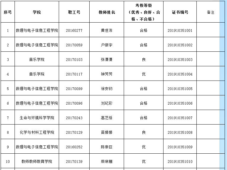 根据《网络赌博网站 青年教师助讲培养实施办法(试行)》(温大行政〔2013〕115号),学校于近期组织开展了2019年1月份青年教师助讲培养考核工作,数理与电子信息工程学院黄世沛等16位教师通过考核,现将具体考核结果公布如下: