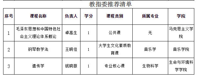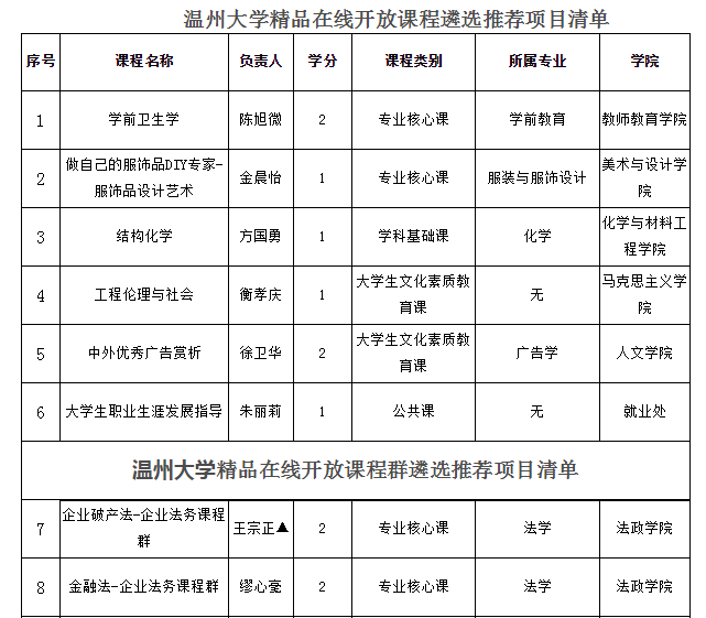 精品在线开放课程(慕课)项目建设管理办法》(温大行政〔2018〕282号)的相关规定,经校内外专家评审,同意推荐《学前卫生学》等6门课程、《企业法务课程群》等51门课程13个课程群参评省级精品在线开放课程,《毛泽东思想和中国特色社会主义理论体系概论》等3门课程经所在学科教指委推荐参评省级精品在线开放课程。