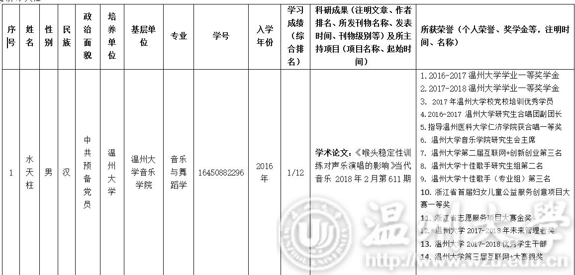 按照《普通高等学校研究生国家奖学金评审办法》教财[2014]1号、《网络赌博网站 研究生国家奖学金管理办法(试行)》[(2013)159号]和《网络赌博网站 研究生国家奖学金评定细则》[行政〔2014〕9号]等文件精神,经过自主申请、资格审查、研究生国家奖学金评审委员会评选等环节,拟推荐的名单予以公示如下:16音研水天柱