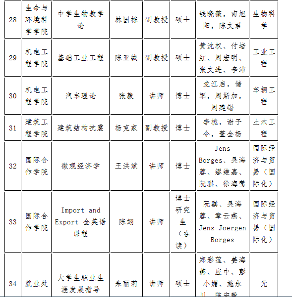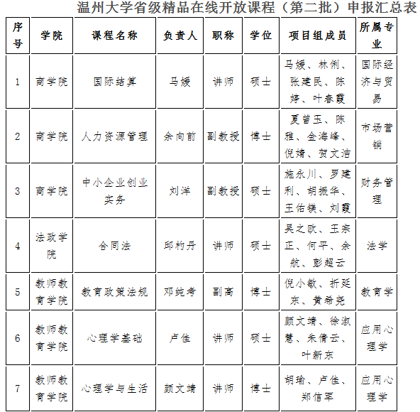 在《关于组织开展第二批省精品在线开放课程建设工作的通知》(省高校课程共享联盟函〔2017〕1 号)文件中已申报建设,且相关课程资源建设在“浙江省高等学校在线开放课程共享平台”(以下简称“省平台”)(//zjedu.moocollege.com/)的课程,立项指标参看《浙江省高等学校精品在线开放课程立项与认定办法(试行)》(附件4)。我校申报名单如下: